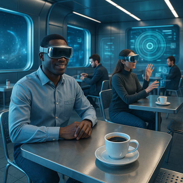 Los clientes pueden disfrutar de cafés de especialidad, blends gourmet y repostería artesanal, mientras acceden a experiencias virtuales exclusivas con Vision Pro, HoloLens y las futuras Apple Lens, disponibles para alquiler en el local.