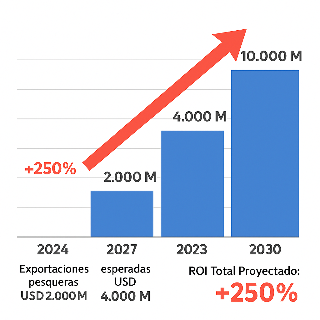 📈 2024: Exportaciones pesqueras USD 2.000 M ➡️ 2027: Exportaciones esperadas USD 4.000 M ➡️ 2030: Exportaciones objetivo USD 10.000 M 🌎 ROI Total Proyectado: +250%