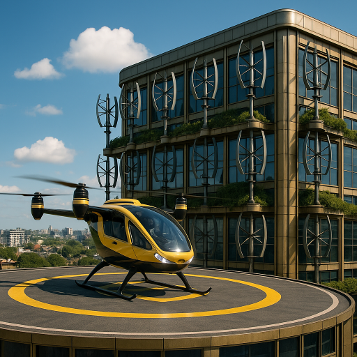 - Integración de paneles solares flexibles entre los marcos, complementando los rotores eólicos.