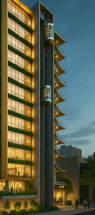 Se adosan escaleras metálicas abiertas de estructura liviana, combinadas con dos ascensores panorámicos de vidrio templado que recorren toda la altura de la torre.