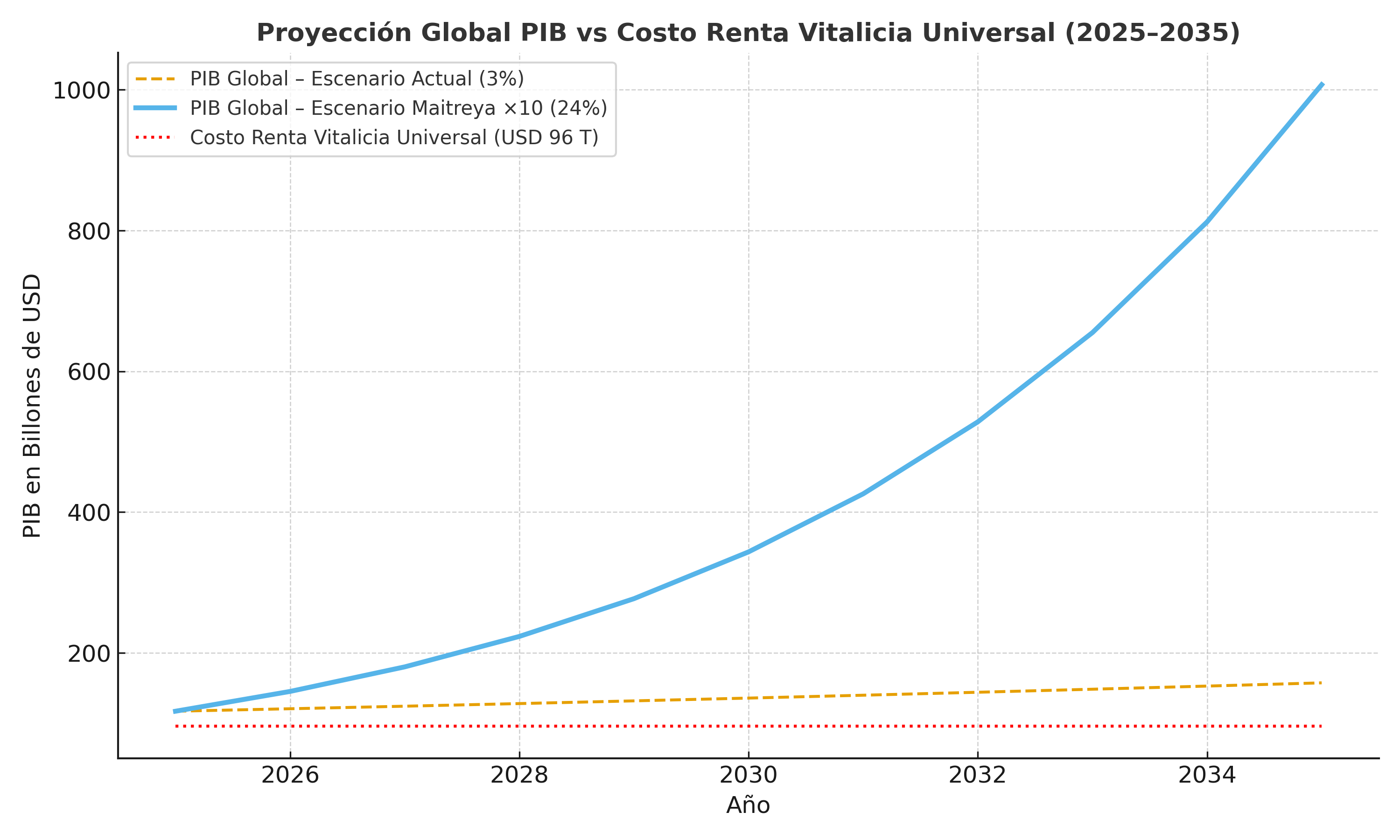 A continuación, se muestra la proyección comparativa del PIB mundial (escenario actual y escenario Maitreya ×10) frente al costo constante de la renta vitalicia universal.