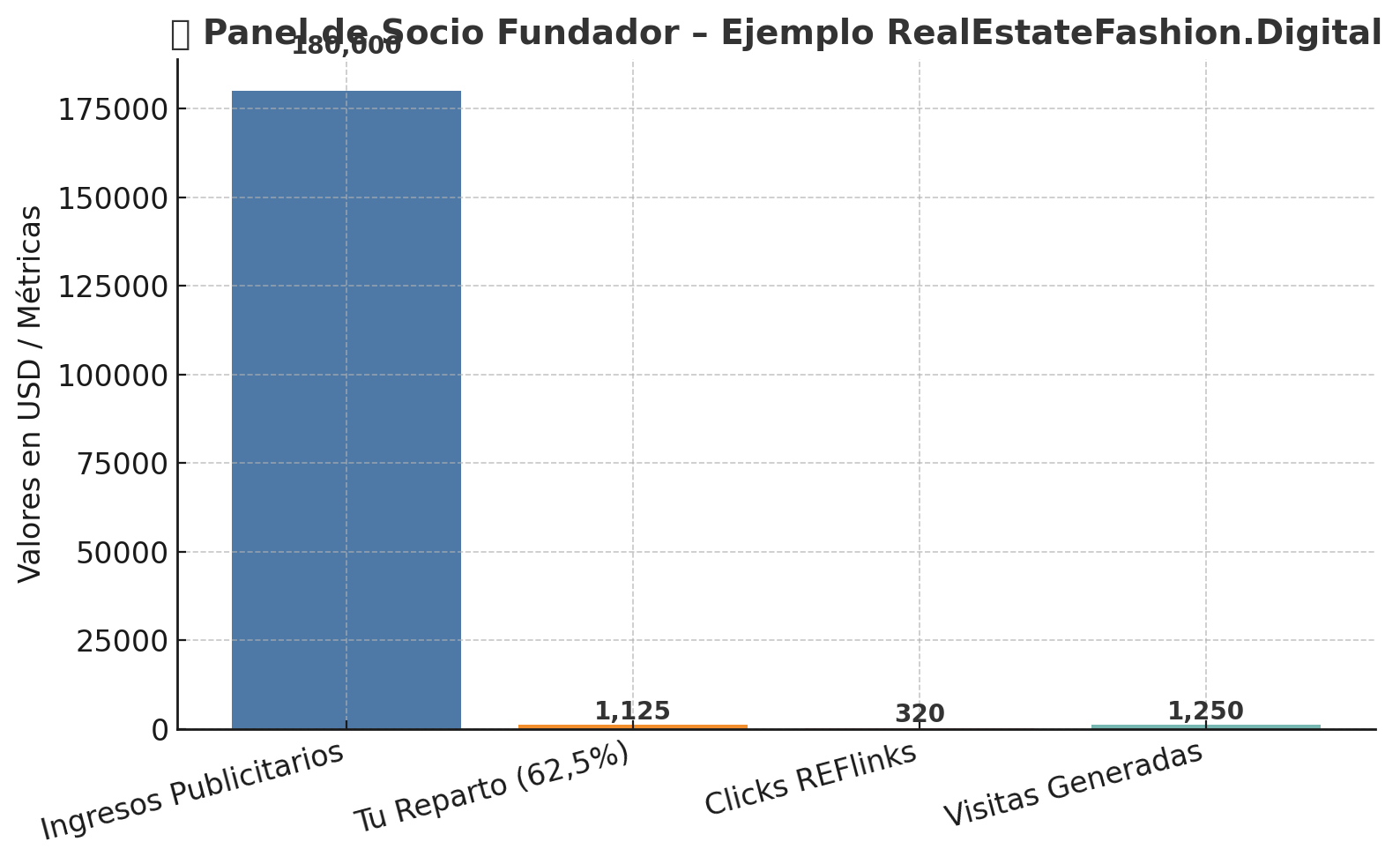 - Cada socio fundador tendrá un panel online donde podrá consultar: ingresos publicitarios globales, su reparto correspondiente (62,5% neto total), y el historial de pagos recibidos.